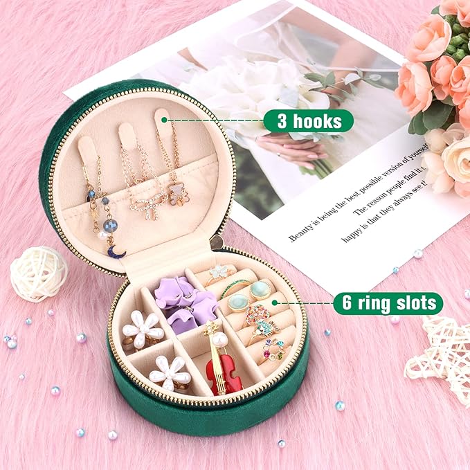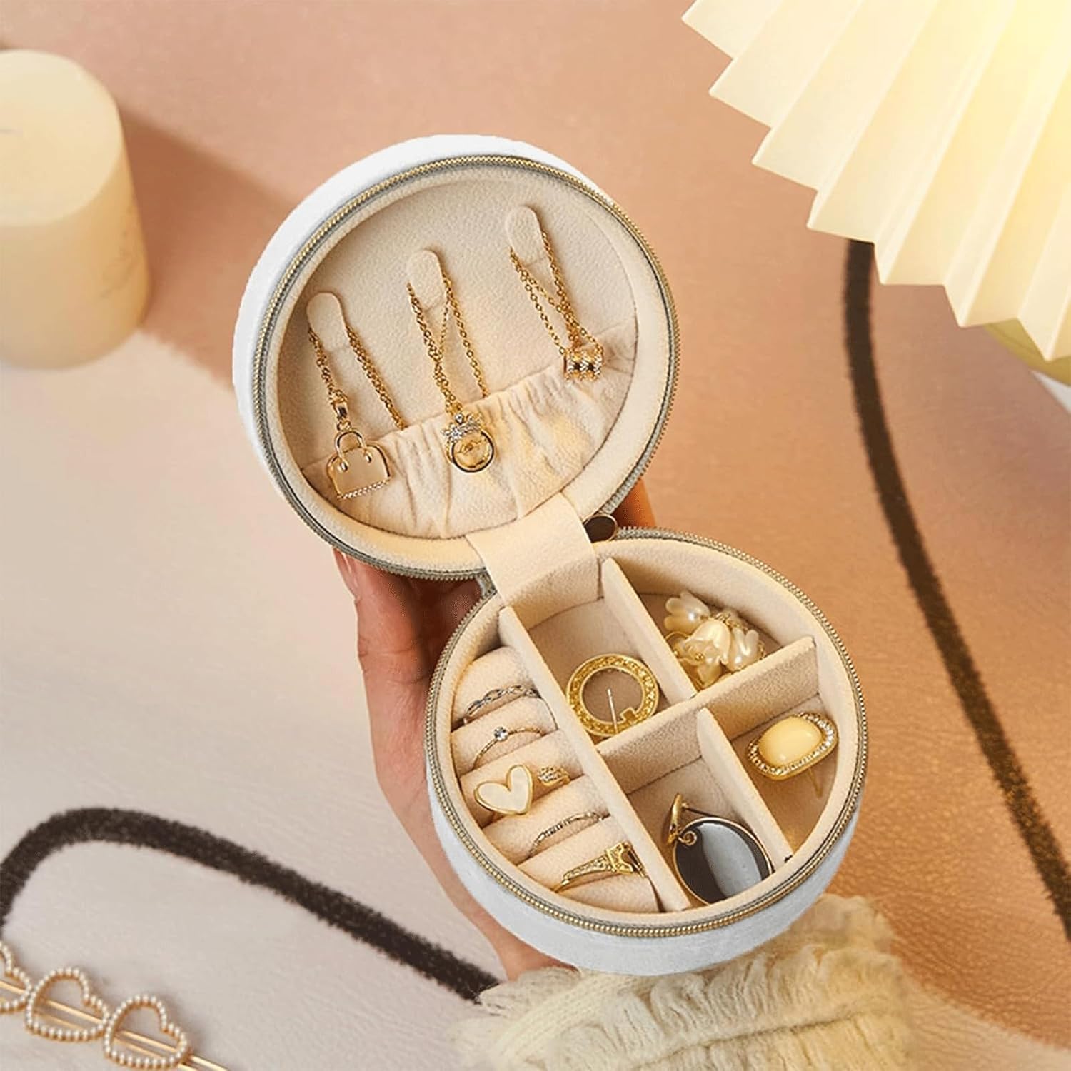 Este alhajero redondo pequeño, elaborado en simil cuerina, ofrece una solución práctica y elegante para guardar tus joyas. Su diseño compacto facilita el transporte y almacenamiento, mientras que el cierre seguro protege tus accesorios de manera confiable. Ideal para mantener organizados anillos, aretes y collares pequeños, combina funcionalidad con un acabado sofisticado.